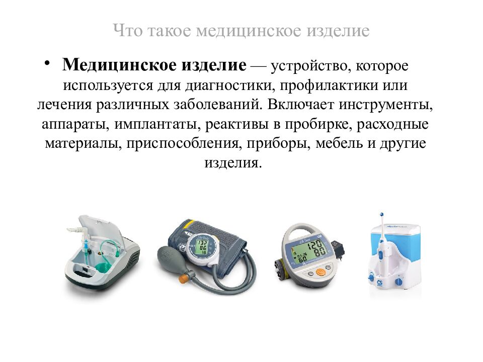 Медицинское изделие — устройство, которое используется для диагностики, профилактики или лечения различных заболеваний. Включает инструменты, аппараты, имплантаты, реактивы в пробирке, расходные материалы, приспособления, приборы, мебель и другие изделия.