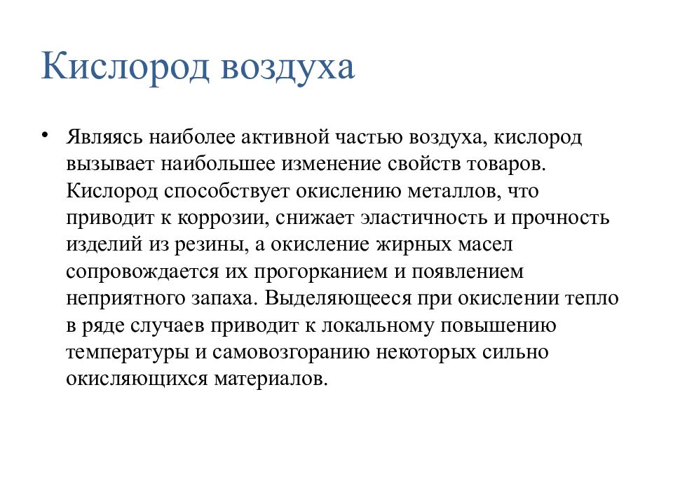 Являясь наиболее активной частью воздуха, кислород вызывает наибольшее изменение свойств товаров. Кислород способствует окислению металлов, что приводит к коррозии, снижает эластичность и прочность изделий из резины, а окисление жирных масел сопровождается их прогорканием и появлением неприятного запаха. Выделяющееся при окислении тепло в ряде случаев приводит к локальному повышению температуры и самовозгоранию некоторых сильно окисляющихся материалов.