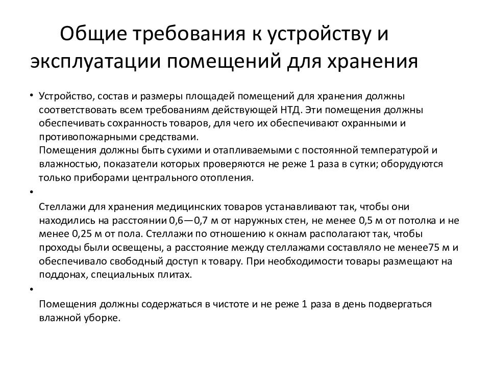 Устройство, состав и размеры площадей помещений для хранения должны соответствовать всем требованиям действующей НТД. Эти помещения должны обеспечивать сохранность товаров, для чего их обеспечивают охранными и противопожарными средствами. Помещения должны быть сухими и отапливаемыми с постоянной температурой и влажностью, показатели которых проверяются не реже 1 раза в сутки; оборудуются только приборами центрального отопления. Стеллажи для хранения медицинских товаров устанавливают так, чтобы они находились на расстоянии 0,6—0,7 м от наружных стен, не менее 0,5 м от потолка и не менее 0,25 м от пола. Стеллажи по отношению к окнам располагают так, чтобы проходы были освещены, а расстояние между стеллажами составляло не менее75 м и обеспечивало свободный доступ к товару. При необходимости товары размещают на поддонах, специальных плитах. Помещения должны содержаться в чистоте и не реже 1 раза в день подвергаться влажной уборке.