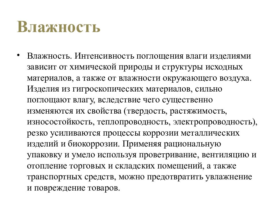 Влажность. Интенсивность поглощения влаги изделиями зависит от химической природы и структуры исходных материалов, а также от влажности окружающего воздуха. Изделия из гигроскопических материалов, сильно поглощают влагу, вследствие чего существенно изменяются их свойства (твердость, растяжимость, износостойкость, теплопроводность, электропроводность), резко усиливаются процессы коррозии металлических изделий и биокоррозии. Применяя рациональную упаковку и умело используя проветривание, вентиляцию и отопление торговых и складских помещений, а также транспортных средств, можно предотвратить увлажнение и повреждение товаров.