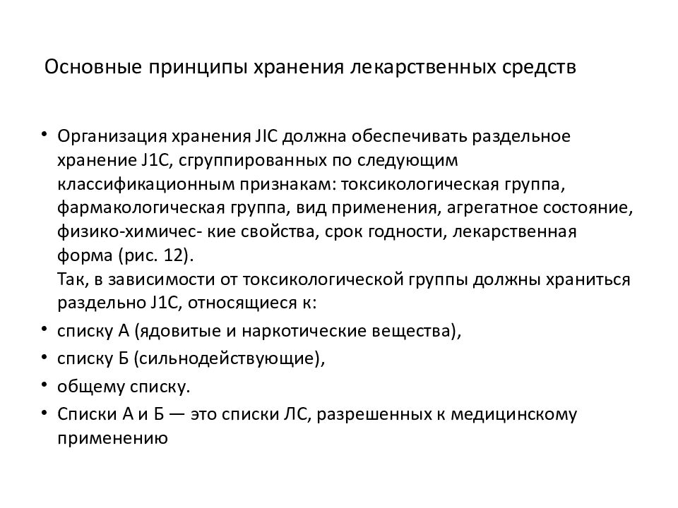 Организация хранения JIC должна обеспечивать раздельное хранение J1C, сгруппированных по следующим классификационным признакам: токсикологическая группа, фармакологическая группа, вид применения, агрегатное состояние, физико-химичес - кие свойства, срок годности, лекарственная форма (рис. 12). Так, в зависимости от токсикологической группы должны храниться раздельно J1C, относящиеся к: списку А (ядовитые и наркотические вещества), списку Б (сильнодействующие), общему списку. Списки А и Б — это списки ЛС, разрешенных к медицинскому применению