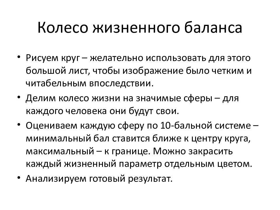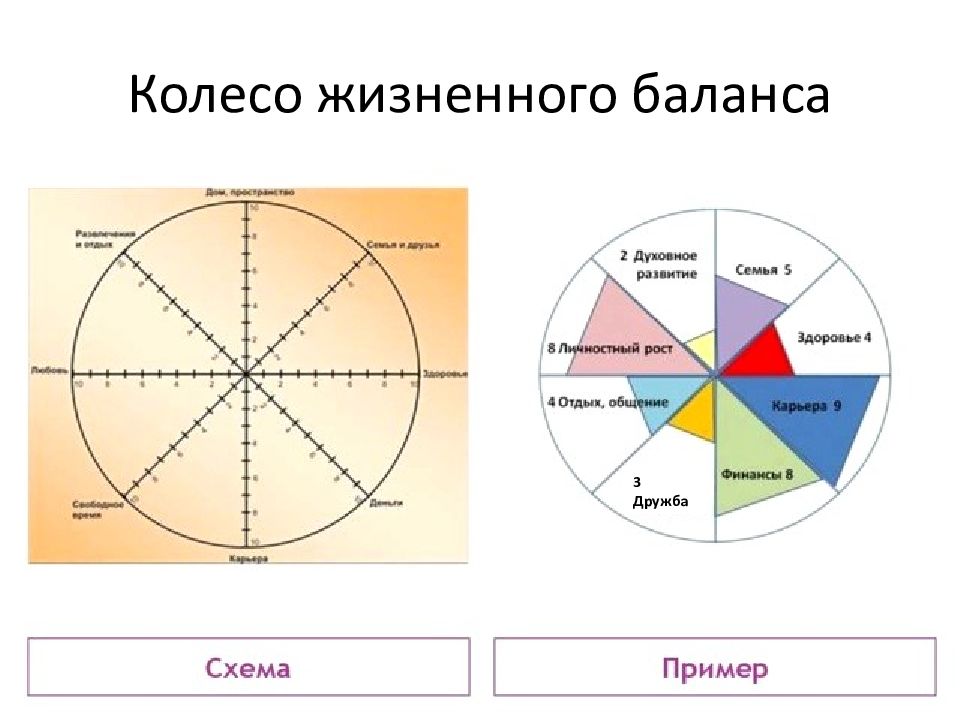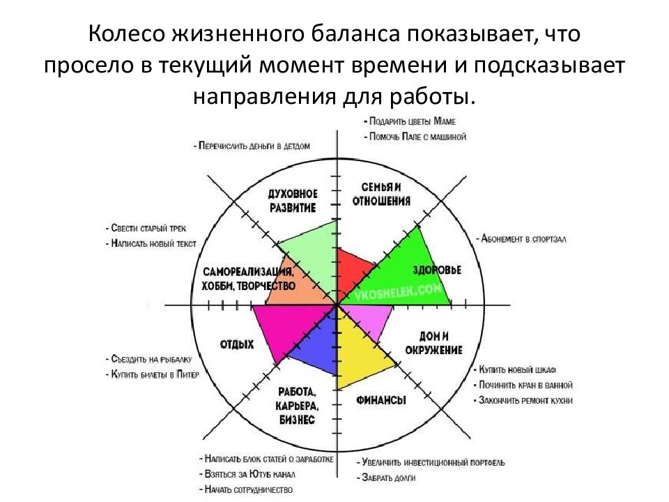 Слайд 7: Колесо жизненного баланса показывает, что просело в текущий момент времени и подсказывает направления для работы