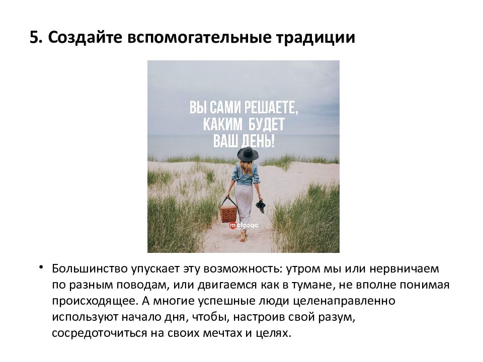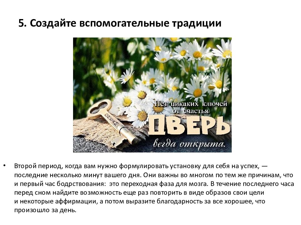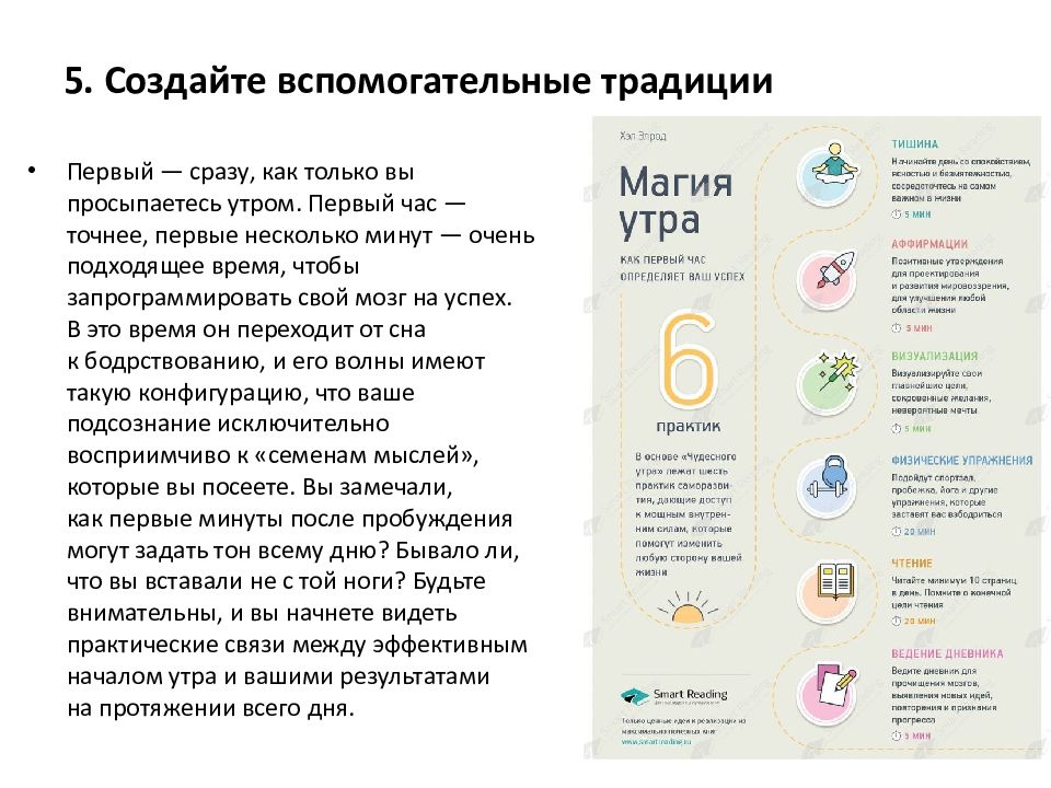 Большинство упускает эту возможность: утром мы или нервничаем по разным поводам, или двигаемся как в тумане, не вполне понимая происходящее. А многие успешные люди целенаправленно используют начало дня, чтобы, настроив свой разум, сосредоточиться на своих мечтах и целях. 5. Создайте вспомогательные традиции