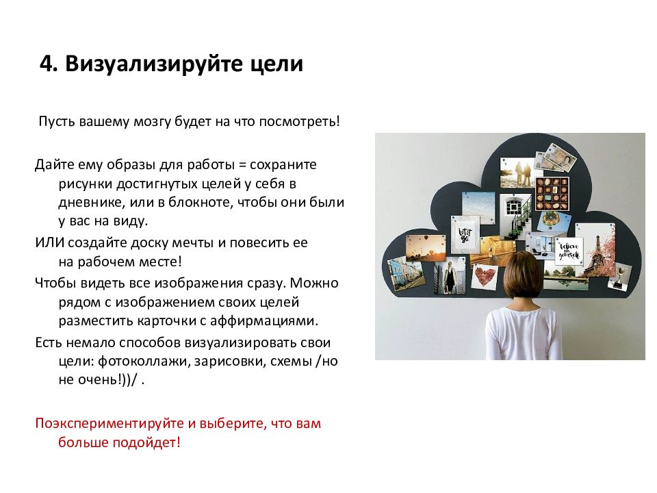 Пусть вашему мозгу будет на что посмотреть! Дайте ему образы для работы = сохраните рисунки достигнутых целей у себя в дневнике, или в блокноте, чтобы они были у вас на виду. ИЛИ создайте доску мечты и повесить ее на рабочем месте! Чтобы видеть все изображения сразу. Можно рядом с изображением своих целей разместить карточки с аффирмациями. Есть немало способов визуализировать свои цели: фотоколлажи, зарисовки, схемы /но не очень!))/. Поэкспериментируйте и выберите, что вам больше подойдет!