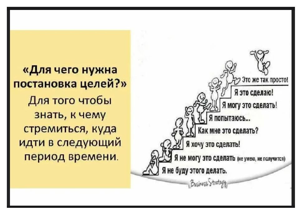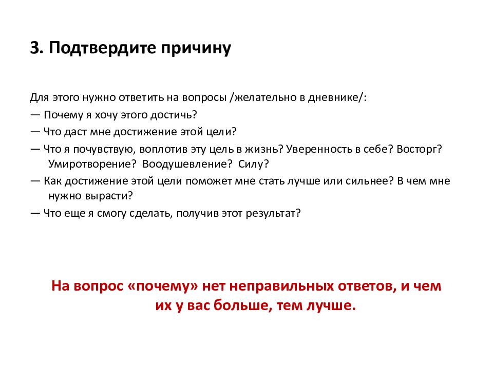 Для этого нужно ответить на вопросы /желательно в дневнике/: — Почему я хочу этого достичь? — Что даст мне достижение этой цели? — Что я почувствую, воплотив эту цель в жизнь? Уверенность в себе? Восторг? Умиротворение? Воодушевление? Силу? — Как достижение этой цели поможет мне стать лучше или сильнее? В чем мне нужно вырасти? — Что еще я смогу сделать, получив этот результат? На вопрос «почему» нет неправильных ответов, и чем их у вас больше, тем лучше.