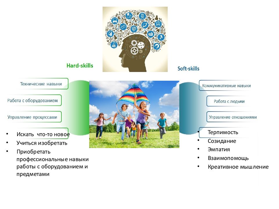 Терпимость Созидание Эмпатия Взаимопомощь Креативное мышление Искать что-то новое Учиться изобретать Приобретать профессиональные навыки работы с оборудованием и предметами