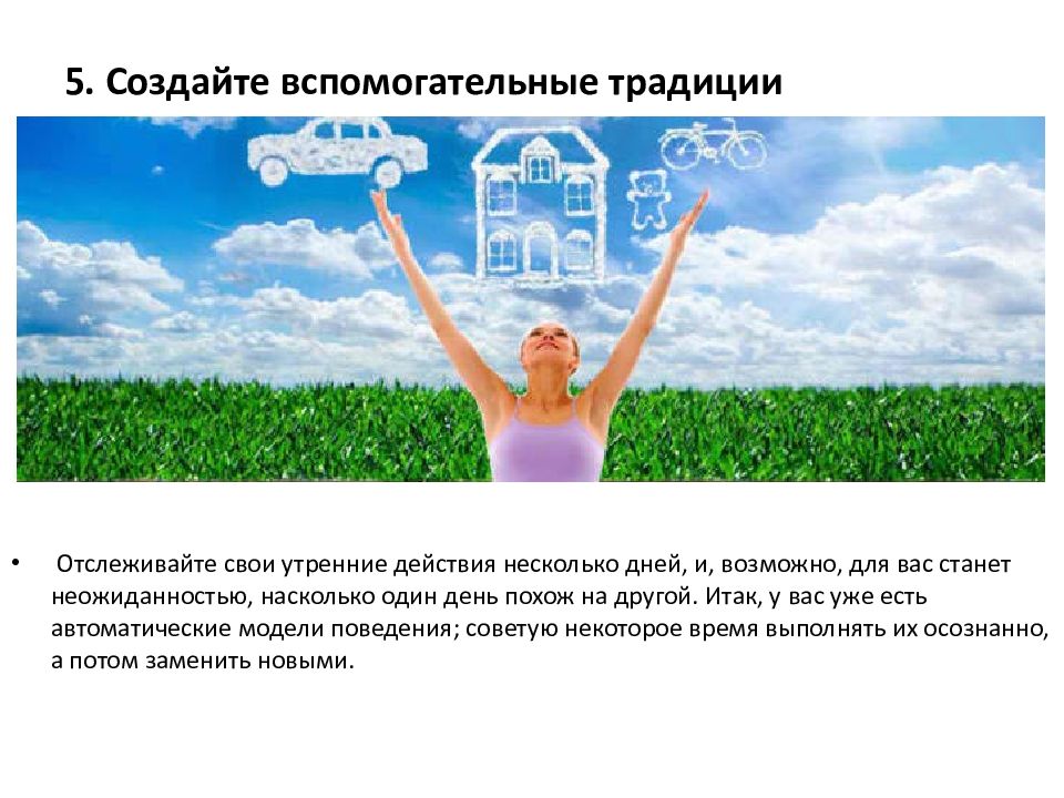 Последний слайд презентации: Как формулировать цель в повседневной жизни: 5. Создайте вспомогательные традиции