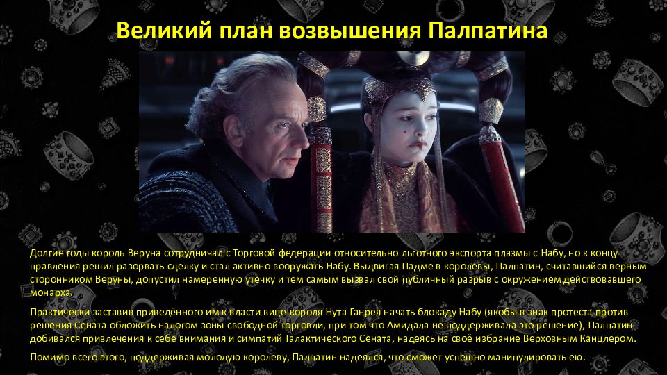 Долгие годы король Веруна сотрудничал с Торговой федерации относительно льготного экспорта плазмы с Набу, но к концу правления решил разорвать сделку и стал активно вооружать Набу. Выдвигая Падме в королевы, Палпатин, считавшийся верным сторонником Веруны, допустил намеренную утечку и тем самым вызвал свой публичный разрыв с окружением действовавшего монарха. Практически заставив приведённого им к власти вице-короля Нута Ганрея начать блокаду Набу (якобы в знак протеста против решения Сената обложить налогом зоны свободной торговли, при том что Амидала не поддерживала это решение), Палпатин добивался привлечения к себе внимания и симпатий Галактического Сената, надеясь на своё избрание Верховным Канцлером. Помимо всего этого, поддерживая молодую королеву, Палпатин надеялся, что сможет успешно манипулировать ею. Великий план возвышения Палпатина