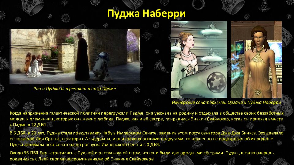 Пуджа Наберри Рио и Пуджа встречают тётю Падме Когда напряжения галактической политики перегружали Падме, она уезжала на родину и отдыхала в обществе своих беззаботных молодых племянниц, которых она нежно любила. Пудже, как и её сестре, понравился Энакин Скайуокер, когда он приехал вместе с Падме в 22 ДБЯ В 6 ДБЯ, в 20 лет, Пуджа стала представлять Набу в Имперском Сенате, заменив этом посту сенатора Джа-Джа Бинкса. Это сделало её коллегой Леи Органа, сенатора с Альдераана, и они стали хорошими подругами, совершенно не подозревая об их родстве. Пуджа занимала пост сенатора до роспуска Имперского Сената в 0 ДБЯ. Около 36 ПБЯ Лея встретилась с Пуджей и рассказала ей о том, что они были двоюродными сёстрами. Пуджа, в свою очередь, поделилась с Леей своими воспоминаниями об Энакине Скайуокере Имперские сенаторы Лея Органа и Пуджа Наберри