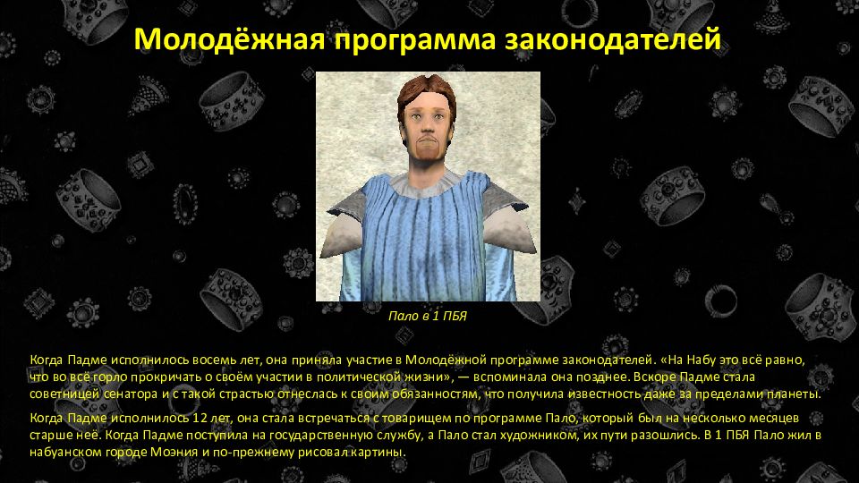 Когда Падме исполнилось восемь лет, она приняла участие в Молодёжной программе законодателей. «На Набу это всё равно, что во всё горло прокричать о своём участии в политической жизни», — вспоминала она позднее. Вскоре Падме стала советницей сенатора и с такой страстью отнеслась к своим обязанностям, что получила известность даже за пределами планеты. Когда Падме исполнилось 12 лет, она стала встречаться с товарищем по программе Пало, который был на несколько месяцев старше неё. Когда Падме поступила на государственную службу, а Пало стал художником, их пути разошлись. В 1 ПБЯ Пало жил в набуанском городе Моэния и по-прежнему рисовал картины. Молодёжная программа законодателей Пало в 1 ПБЯ