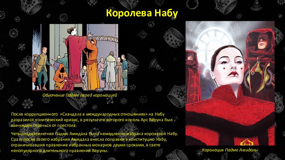 После коррупционного «Скандала в международных отношениях» на Набу разразился политический кризис, в результате которого король Арс Веруна был вынужден отречься от престола. Четырнадцатилетняя Падме Амидала была немедленно избрана королевой Набу. Сразу после своего избрания Амидала внесла поправки в конституцию Набу, ограничивавшие правление избранных монархов двумя сроками, в свете непопулярного длительного правления Веруны. Королева Набу Облачение Падме перед коронацией Коронация Падме Амидалы