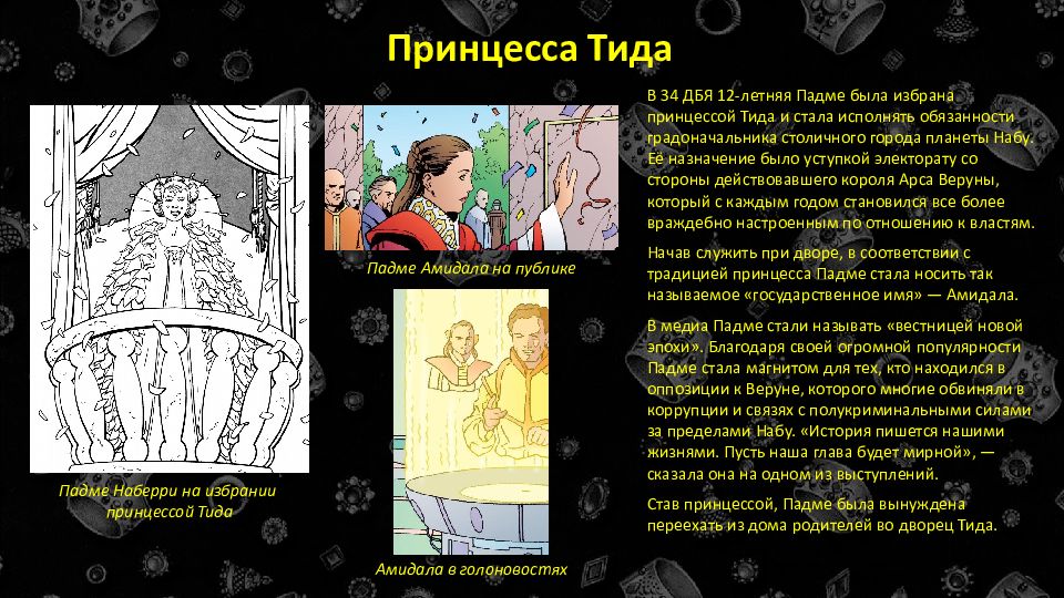 В 34 ДБЯ 12-летняя Падме была избрана принцессой Тида и стала исполнять обязанности градоначальника столичного города планеты Набу. Её назначение было уступкой электорату со стороны действовавшего короля Арса Веруны, который с каждым годом становился все более враждебно настроенным по отношению к властям. Начав служить при дворе, в соответствии с традицией принцесса Падме стала носить так называемое «государственное имя» — Амидала. В медиа Падме стали называть «вестницей новой эпохи». Благодаря своей огромной популярности Падме стала магнитом для тех, кто находился в оппозиции к Веруне, которого многие обвиняли в коррупции и связях с полукриминальными силами за пределами Набу. «История пишется нашими жизнями. Пусть наша глава будет мирной», — сказала она на одном из выступлений. Став принцессой, Падме была вынуждена переехать из дома родителей во дворец Тида. Принцесса Тида Падме Наберри на избрании принцессой Тида Падме Амидала на публике Амидала в голоновостях