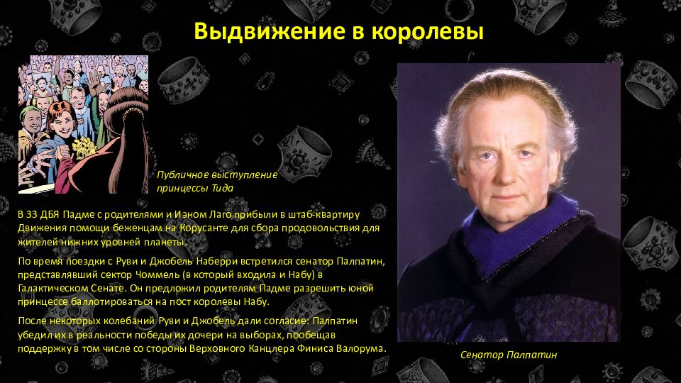 В 33 ДБЯ Падме с родителями и Иэном Лаго прибыли в штаб-квартиру Движения помощи беженцам на Корусанте для сбора продовольствия для жителей нижних уровней планеты. По время поездки с Руви и Джобель Наберри встретился сенатор Палпатин, представлявший сектор Чоммель (в который входила и Набу) в Галактическом Сенате. Он предложил родителям Падме разрешить юной принцессе баллотироваться на пост королевы Набу. После некоторых колебаний Руви и Джобель дали согласие: Палпатин убедил их в реальности победы их дочери на выборах, пообещав поддержку в том числе со стороны Верховного Канцлера Финиса Валорума. Выдвижение в королевы Сенатор Палпатин Публичное выступление принцессы Тида