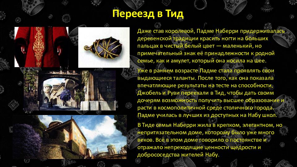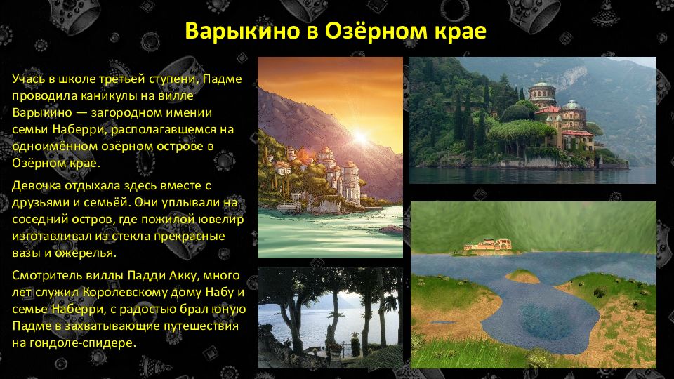 Варыкино в Озёрном крае Учась в школе третьей ступени, Падме проводила каникулы на вилле Варыкино — загородном имении семьи Наберри, располагавшемся на одноимённом озёрном острове в Озёрном крае. Девочка отдыхала здесь вместе с друзьями и семьёй. Они уплывали на соседний остров, где пожилой ювелир изготавливал из стекла прекрасные вазы и ожерелья. Смотритель виллы Падди Акку, много лет служил Королевскому дому Набу и семье Наберри, с радостью брал юную Падме в захватывающие путешествия на гондоле-спидере.