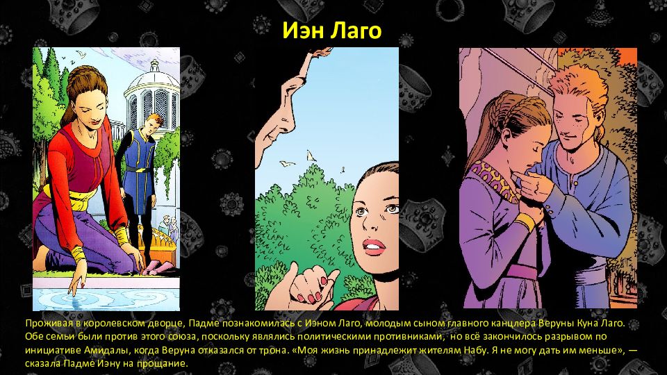 Проживая в королевском дворце, Падме познакомилась с Иэном Лаго, молодым сыном главного канцлера Веруны Куна Лаго. Обе семьи были против этого союза, поскольку являлись политическими противниками, но всё закончилось разрывом по инициативе Амидалы, когда Веруна отказался от трона. «Моя жизнь принадлежит жителям Набу. Я не могу дать им меньше», — сказала Падме Иэну на прощание. Иэн Лаго