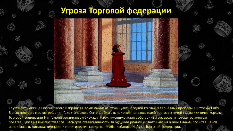 Спустя пять месяцев после своего избрания Падме Амидала столкнулась с одной из самых серьёзных проблем в истории Набу. В знак протеста против решения Галактического Сената облагать налогом пользователей торговых путей галактики вице-король Торговой федерации Нут Ганрей организовал блокаду Набу, имевшую мало собственных ресурсов и потому во многом полагавшуюся на импорт товаров. Весь груз ответственности за будущее родной планеты лёг на плечи Падме, попытавшейся использовать дипломатические и политические средства, чтобы избавить Набу от Торговой федерации. Угроза Торговой федерации