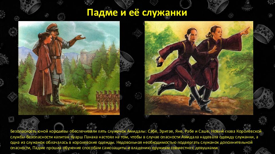 Безопасность юной королевы обеспечивали пять служанок Амидалы: Сабе, Эритае, Яне, Рабе и Саше. Новый глава Королевской службы безопасности капитан Куарш Панака настоял на том, чтобы в случае опасности Амидала надевала одежду служанки, а одна из служанок облачалась в королевские одежды. Недовольная необходимостью подвергать служанок дополнительной опасности, Падме прошла обучение способам самозащиты и владению оружием совместно с девушками. Падме и её служанки
