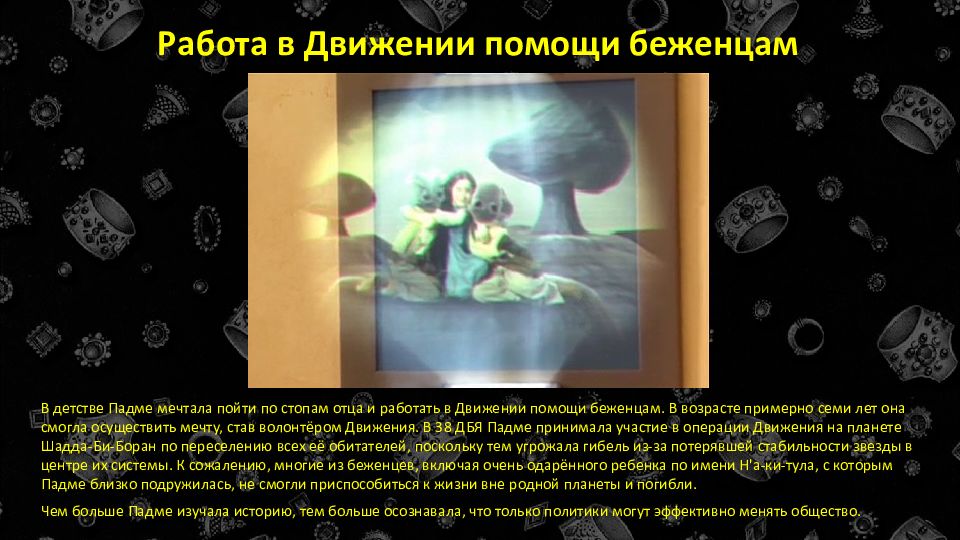 В детстве Падме мечтала пойти по стопам отца и работать в Движении помощи беженцам. В возрасте примерно семи лет она смогла осуществить мечту, став волонтёром Движения. В 38 ДБЯ Падме принимала участие в операции Движения на планете Шадда-Би-Боран по переселению всех её обитателей, поскольку тем угрожала гибель из-за потерявшей стабильности звезды в центре их системы. К сожалению, многие из беженцев, включая очень одарённого ребенка по имени Н'а-ки-тула, с которым Падме близко подружилась, не смогли приспособиться к жизни вне родной планеты и погибли. Чем больше Падме изучала историю, тем больше осознавала, что только политики могут эффективно менять общество. Работа в Движении помощи беженцам