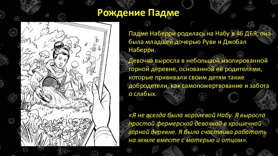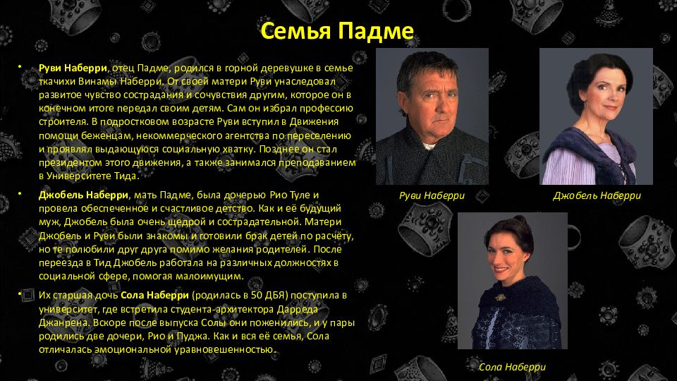 Семья Падме Джобель Наберри Руви Наберри Сола Наберри Руви Наберри, отец Падме, родился в горной деревушке в семье ткачихи Винамы Наберри. От своей матери Руви унаследовал развитое чувство сострадания и сочувствия другим, которое он в конечном итоге передал своим детям. Сам он избрал профессию строителя. В подростковом возрасте Руви вступил в Движения помощи беженцам, некоммерческого агентства по переселению и проявлял выдающуюся социальную хватку. Позднее он стал президентом этого движения, а также занимался преподаванием в Университете Тида. Джобель Наберри, мать Падме, была дочерью Рио Туле и провела обеспеченное и счастливое детство. Как и её будущий муж, Джобель была очень щедрой и сострадательной. Матери Джобель и Руви были знакомы и готовили брак детей по расчёту, но те полюбили друг друга помимо желания родителей. После переезда в Тид Джобель работала на различных должностях в социальной сфере, помогая малоимущим. Их старшая дочь Сола Наберри (родилась в 50 ДБЯ) поступила в университет, где встретила студента-архитектора Дарреда Джанрена. Вскоре после выпуска Солы они поженились, и у пары родились две дочери, Рио и Пуджа. Как и вся её семья, Сола отличалась эмоциональной уравновешенностью.