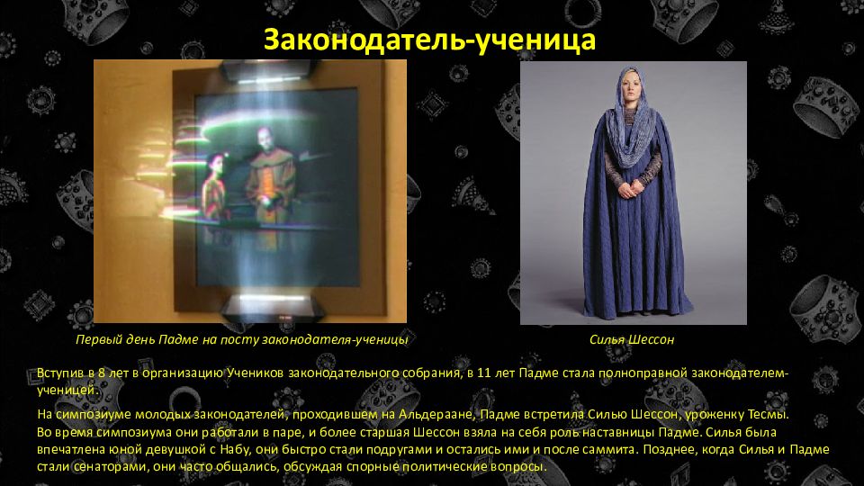 Вступив в 8 лет в организацию Учеников законодательного собрания, в 11 лет Падме стала полноправной законодателем-ученицей. На симпозиуме молодых законодателей, проходившем на Альдераане, Падме встретила Силью Шессон, уроженку Тесмы. Во время симпозиума они работали в паре, и более старшая Шессон взяла на себя роль наставницы Падме. Силья была впечатлена юной девушкой с Набу, они быстро стали подругами и остались ими и после саммита. Позднее, когда Силья и Падме стали сенаторами, они часто общались, обсуждая спорные политические вопросы. Законодатель-ученица Силья Шессон Первый день Падме на посту законодателя-ученицы
