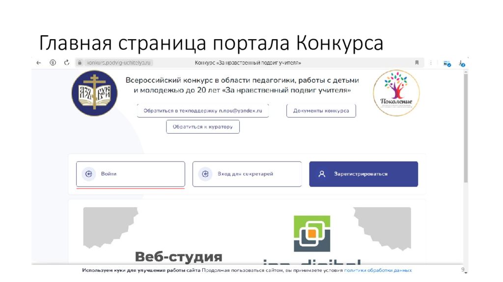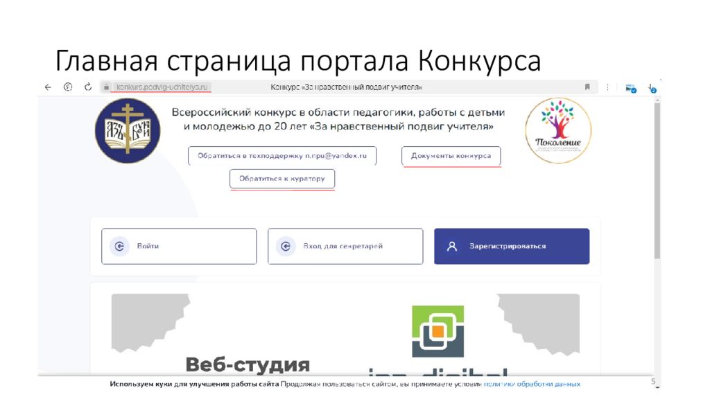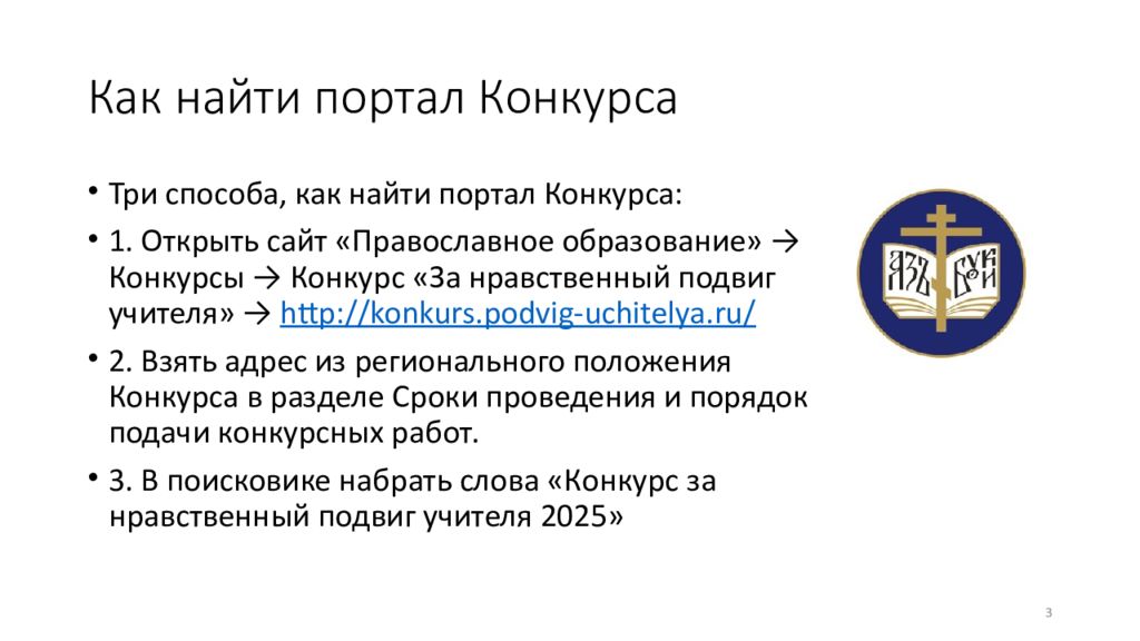 Три способа, как найти портал Конкурса: 1. Открыть сайт «Православное образование» → Конкурсы → Конкурс «За н равственный подвиг учителя» → http://konkurs.podvig-uchitelya.ru/ 2. Взять адрес из регионального положения Конкурса в разделе Сроки проведения и порядок подачи конкурсных работ. 3. В поисковике набрать слова «Конкурс за нравственный подвиг учителя 2025» 3