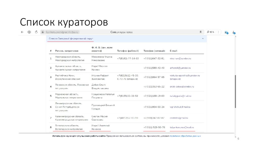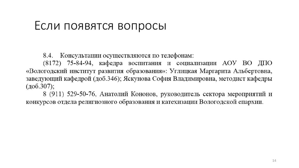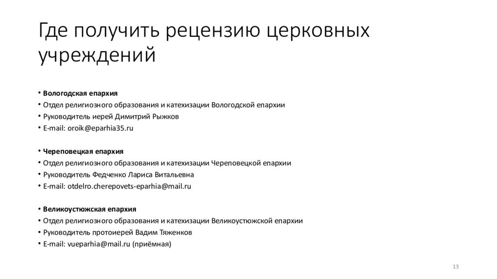 Вологодская епархия Отдел религиозного образования и катехизации Вологодской епархии Руководитель иерей Димитрий Рыжков E- mail : oroik@eparhia35.ru Череповецкая епархия Отдел религиозного образования и катехизации Череповецкой епархии Руководитель Федченко Лариса Витальевна E- mail : otdelro.cherepovets-eparhia@mail.ru Великоустюжская епархия Отдел религиозного образования и катехизации Великоустюжской епархии Руководитель протоиерей Вадим Тяженков E- mail : vueparhia@mail.ru (приёмная) 13