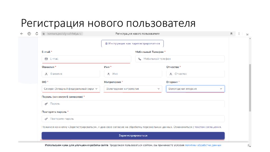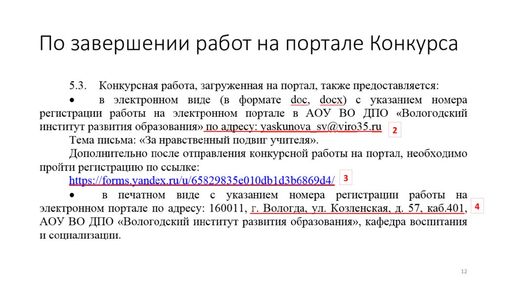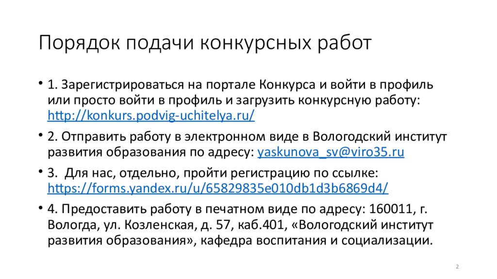 1. Зарегистрироваться на портале Конкурса и войти в профиль или просто войти в профиль и загрузить конкурсную работу: http://konkurs.podvig-uchitelya.ru/ 2. Отправить работу в электронном виде в Вологодский институт развития образования по адресу: yaskunova _ sv @ viro 35. ru 3. Для нас, отдельно, пройти регистрацию по ссылке: https://forms.yandex.ru/u/65829835e010db1d3b6869d4/ 4. Предоставить работу в печатном виде по адресу: 160011, г. Вологда, ул. Козленская, д. 57, каб.401, « Вологодский институт развития образования», кафедра воспитания и социализации. 2