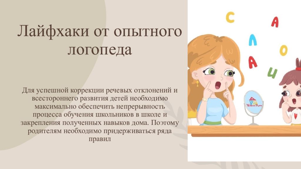 Для успешной коррекции речевых отклонений и всестороннего развития детей необходимо максимально обеспечить непрерывность процесса обучения школьников в школе и закрепления полученных навыков дома. Поэтому родителям необходимо придерживаться ряда правил