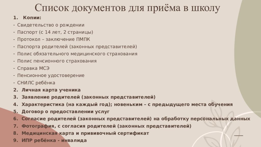 Копии: Свидетельство о рождении Паспорт (с 14 лет, 2 страницы) Протокол – заключение ПМПК Паспорта родителей (законных представителей) Полис обязательного медицинского страхования Полис пенсионного страхования Справка МСЭ Пенсионное удостоверение СНИЛС ребёнка Личная карта ученика Заявление родителей (законных представителей) Характеристика (на каждый год); новеньким – с предыдущего места обучения Договор о предоставлении услуг Согласие родителей (законных представителей) на обработку персональных данных Фотография, с согласия родителей (законных представителей) Медицинская карта и прививочный сертификат ИПР ребёнка - инвалида