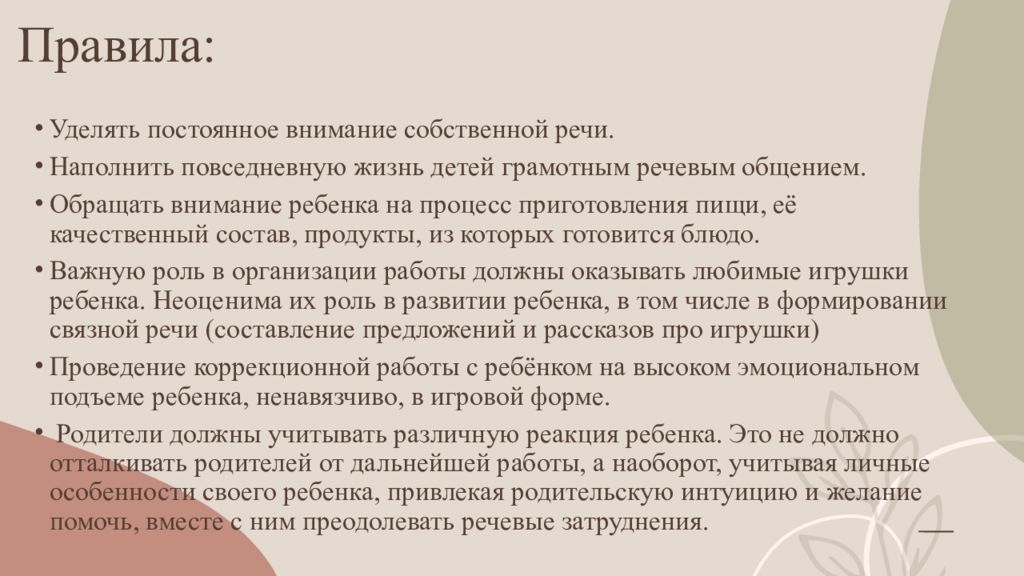 Уделять постоянное внимание собственной речи. Наполнить повседневную жизнь детей грамотным речевым общением. Обращать внимание ребенка на процесс приготовления пищи, её качественный состав, продукты, из которых готовится блюдо. Важную роль в организации работы должны оказывать любимые игрушки ребенка. Неоценима их роль в развитии ребенка, в том числе в формировании связной речи (составление предложений и рассказов про игрушки) Проведение коррекционной работы с ребёнком на высоком эмоциональном подъеме ребенка, ненавязчиво, в игровой форме. Родители должны учитывать различную реакция ребенка. Это не должно отталкивать родителей от дальнейшей работы, а наоборот, учитывая личные особенности своего ребенка, привлекая родительскую интуицию и желание помочь, вместе с ним преодолевать речевые затруднения.