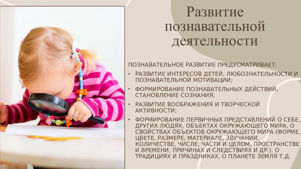 Познавательное развитие предусматривает: развитие интересов детей, любознательности и познавательной мотивации; формирование познавательных действий, становление сознания; развитие воображения и творческой активности; формирование первичных представлений о себе, других людях, объектах окружающего мира, о свойствах объектов окружающего мира (форме, цвете, размере, материале, звучании, количестве, числе, части и целом, пространстве и времени, причинах и следствиях и др.), о традициях и праздниках, о планете Земля т.д.