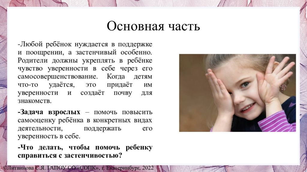 -Любой ребёнок нуждается в поддержке и поощрении, а застенчивый особенно. Родители должны укреплять в ребёнке чувство уверенности в себе через его самосовершенствование. Когда детям что-то удаётся, это придаёт им уверенности и создаёт почву для знакомств. -Задача взрослых – помочь повысить самооценку ребёнка в конкретных видах деятельности, поддержать его уверенность в себе. -Что делать, чтобы помочь ребенку справиться с застенчивостью ? ©Литвинова С.Я. ГАПОУ СО «СОПК», г. Екатеринбург, 2022