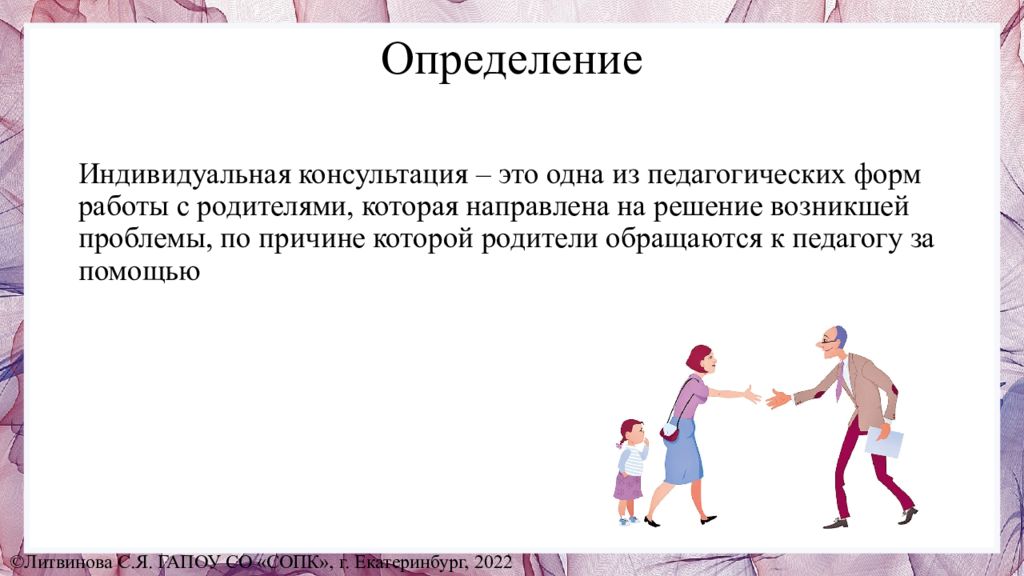 Индивидуальная консультация – это одна из педагогических форм работы с родителями, которая направлена на решение возникшей проблемы, по причине которой родители обращаются к педагогу за помощью ©Литвинова С.Я. ГАПОУ СО «СОПК», г. Екатеринбург, 2022