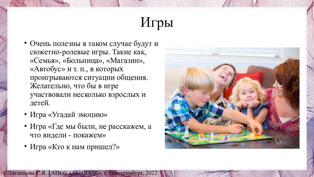 Очень полезны в таком случае будут и сюжетно-ролевые игры. Такие как, «Семья», «Больница», «Магазин», «Автобус» и т. п., в которых проигрываются ситуации общения. Желательно, что бы в игре участвовали несколько взрослых и детей. Игра «Угадай эмоцию » Игра «Где мы были, не расскажем, а что видели - покажем » Игра «Кто к нам пришел?» ©Литвинова С.Я. ГАПОУ СО «СОПК», г. Екатеринбург, 2022