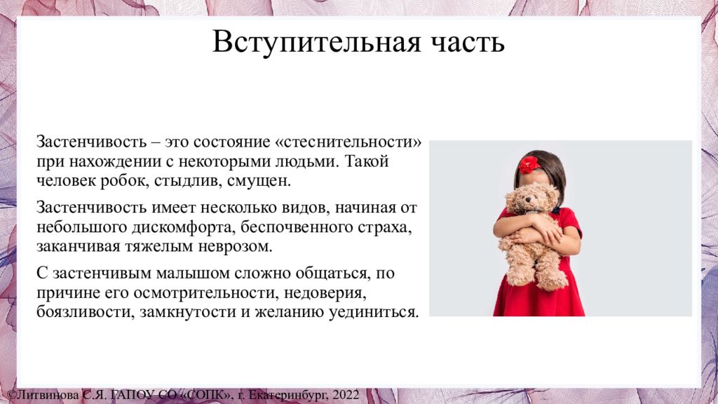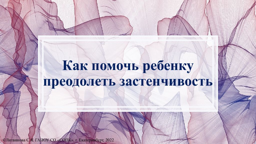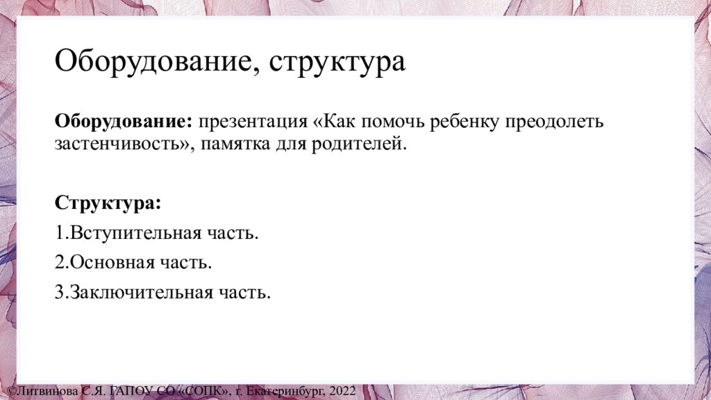 Оборудование: презентация «Как помочь ребенку преодолеть застенчивость», памятка для родителей. Структура : 1.Вступительная часть. 2.Основная часть. 3.Заключительная часть. ©Литвинова С.Я. ГАПОУ СО «СОПК», г. Екатеринбург, 2022