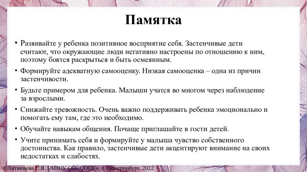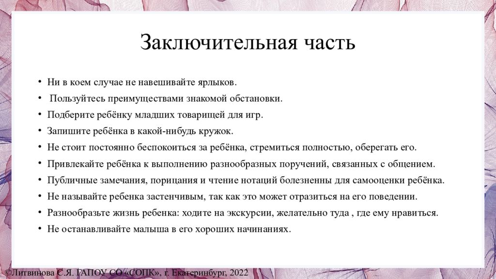 Ни в коем случае не навешивайте ярлыков. Пользуйтесь преимуществами знакомой обстановки. Подберите ребёнку младших товарищей для игр. Запишите ребёнка в какой-нибудь кружок. Не стоит постоянно беспокоиться за ребёнка, стремиться полностью, оберегать его. Привлекайте ребёнка к выполнению разнообразных поручений, связанных с общением. Публичные замечания, порицания и чтение нотаций болезненны для самооценки ребёнка. Не называйте ребенка застенчивым, так как это может отразиться на его поведении. Разнообразьте жизнь ребенка: ходите на экскурсии, желательно туда, где ему нравиться. Не останавливайте малыша в его хороших начинаниях. ©Литвинова С.Я. ГАПОУ СО «СОПК», г. Екатеринбург, 2022