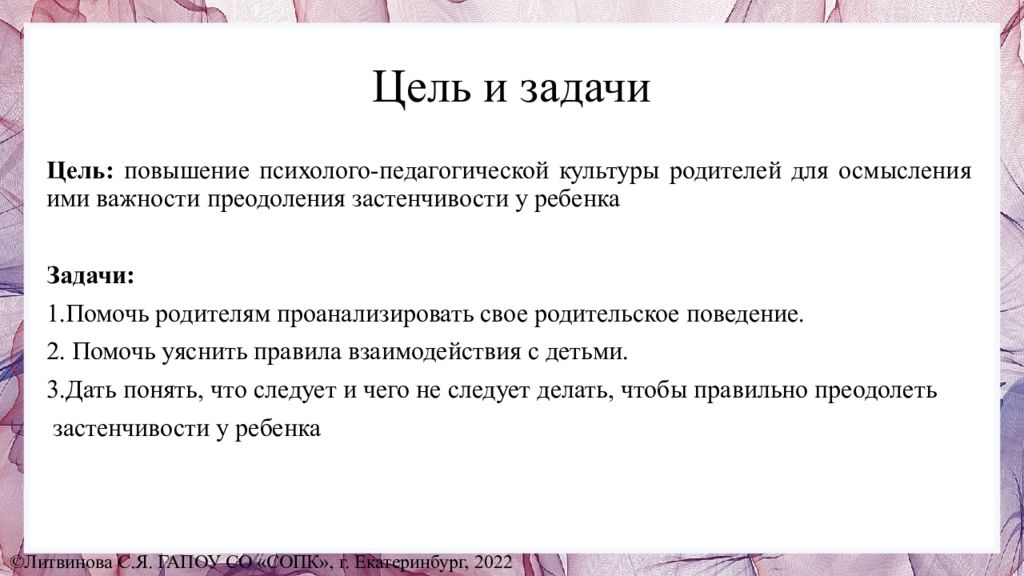 Цель: повышение психолого-педагогической культуры родителей для осмысления ими важности преодоления застенчивости у ребенка Задачи: 1.Помочь родителям проанализировать свое родительское поведение. 2. Помочь уяснить правила взаимодействия с детьми. 3.Дать понять, что следует и чего не следует делать, чтобы правильно преодолеть застенчивости у ребенка ©Литвинова С.Я. ГАПОУ СО «СОПК», г. Екатеринбург, 2022