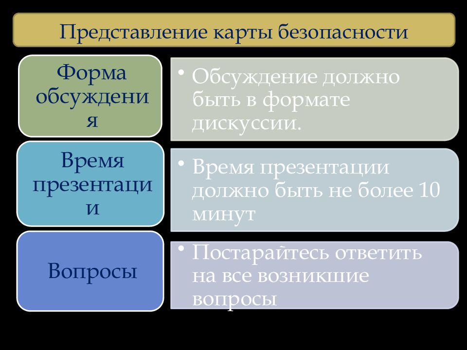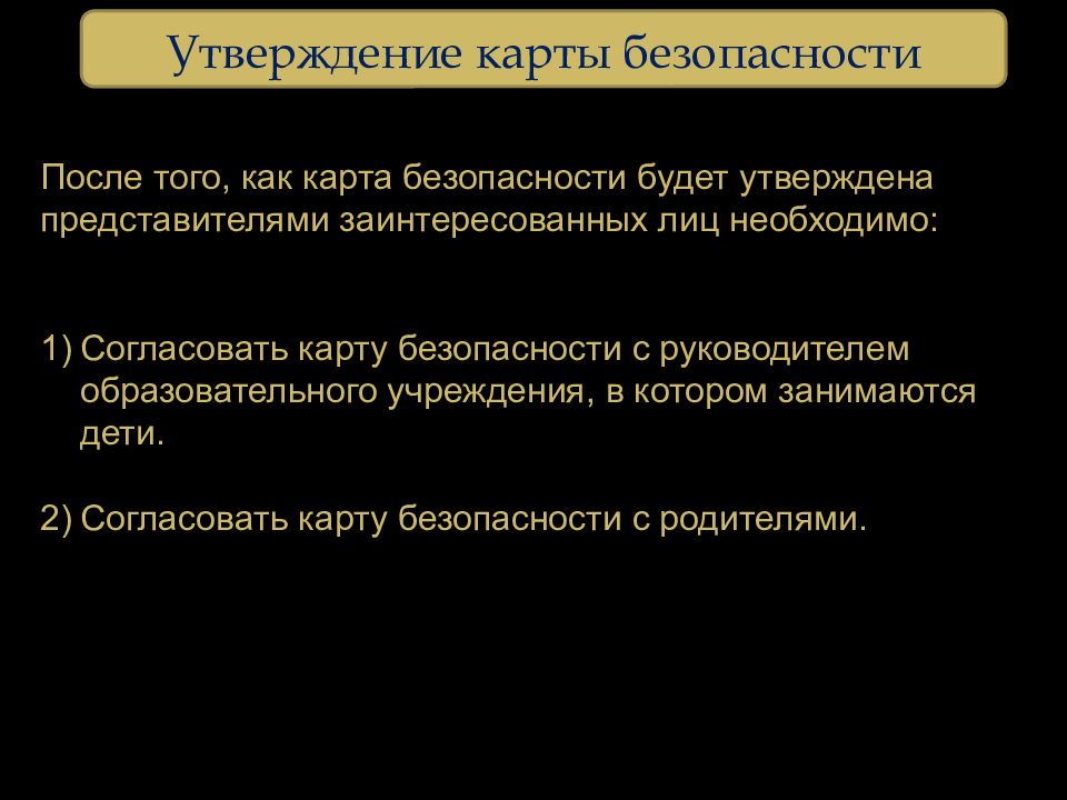 Утверждение карты безопасности После того, как карта безопасности будет утверждена представителями заинтересованных лиц необходимо : Согласовать карту безопасности с руководителем образовательного учреждения, в котором занимаются дети. Согласовать карту безопасности с родителями.