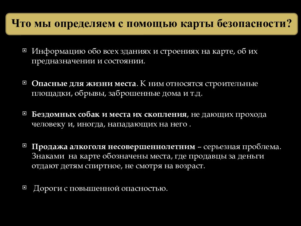 Информацию обо всех зданиях и строениях на карте, об их предназначении и состоянии. Опасные для жизни места. К ним относятся строительные площадки, обрывы, заброшенные дома и т.д. Бездомных собак и места их скопления, не дающих прохода человеку и, иногда, нападающих на него. Продажа алкоголя несовершеннолетним – серьезная проблема. Знаками на карте обозначены места, где продавцы за деньги отдают детям спиртное, не смотря на возраст. Дороги с повышенной опасностью. Что мы определяем с помощью карты безопасности?