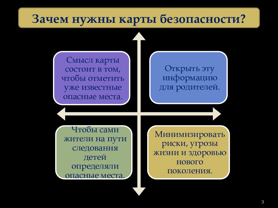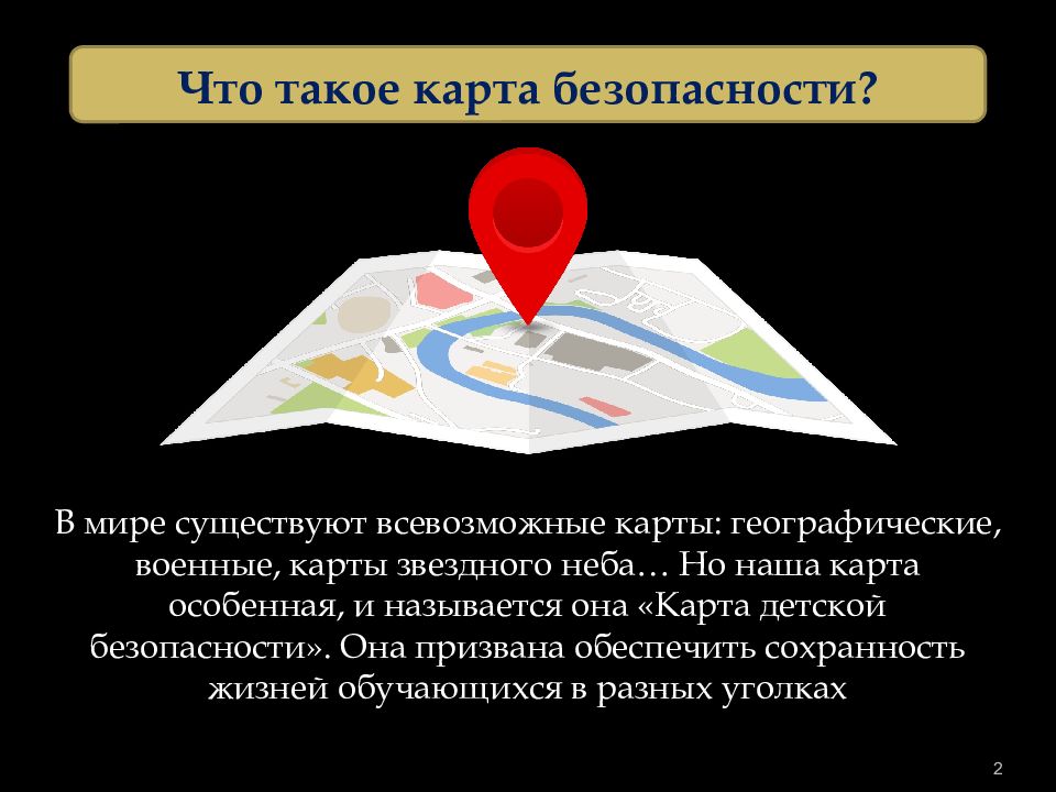 В мире существуют всевозможные карты: географические, военные, карты звездного неба… Но наша карта особенная, и называется она «Карта детской безопасности». Она призвана обеспечить сохранность жизней обучающихся в разных уголках 2 Что такое карта безопасности ?