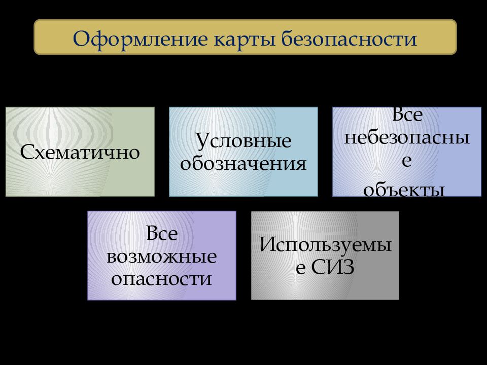 Схематично изображена карта местности 2) Использованы условные обозначения 3) Отмечены опасные места 4) Указаны возможные опасности 5) Указаны необходимые СИЗ 6) Выделены важные моменты с пометкой “ Внимание !!!” Пример оформления карты безопасности