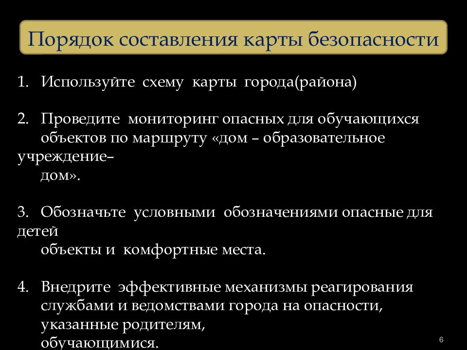 6 Используйте схему карты города(района) Проведите мониторинг опасных для обучающихся объектов по маршруту «дом – образовательное учреждение– дом». 3. Обозначьте условными обозначениями опасные для детей объекты и комфортные места. Внедрите эффективные механизмы реагирования службами и ведомствами города на опасности, указанные родителям, обучающимися. 5. Определите необходимость использования СИЗ. Порядок составления карты безопасности