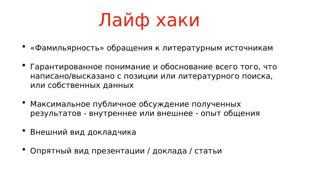 «Фамильярность» обращения к литературным источникам Гарантированное понимание и обоснование всего того, что написано/высказано с позиции или литературного поиска, или собственных данных Максимальное публичное обсуждение полученных результатов - внутреннее или внешнее - опыт общения Внешний вид докладчика Опрятный вид презентации / доклада / статьи