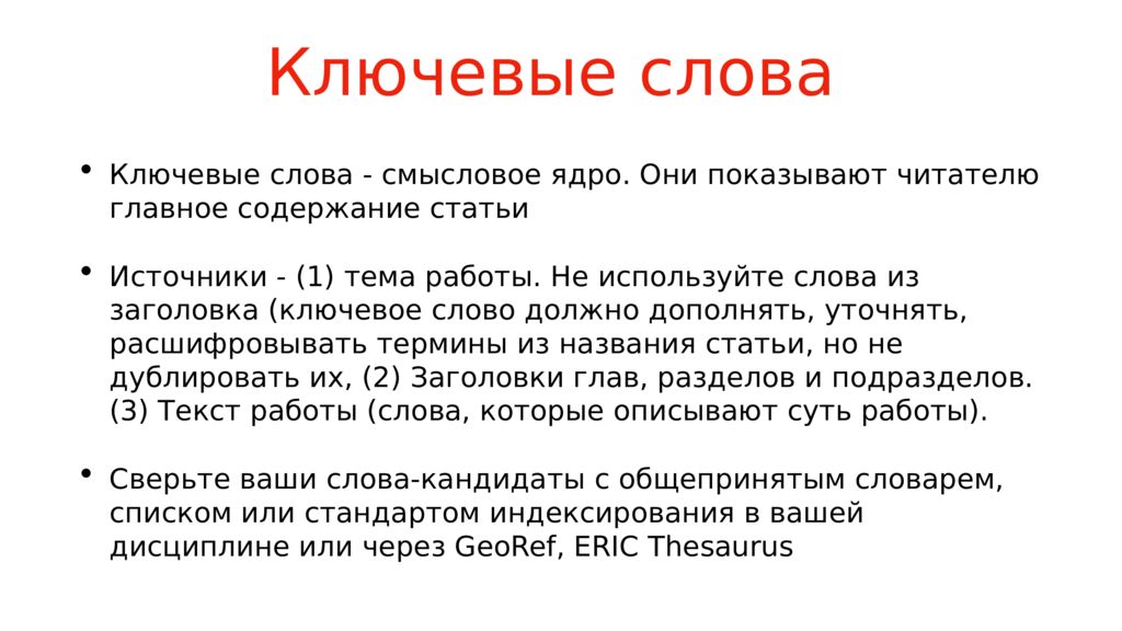 Ключевые слова - смысловое ядро. Они показывают читателю главное содержание статьи Источники - (1) тема работы. Не используйте слова из заголовка (ключевое слово должно дополнять, уточнять, расшифровывать термины из названия статьи, но не дублировать их, (2) Заголовки глав, разделов и подразделов. (3) Текст работы (слова, которые описывают суть работы). Сверьте ваши слова-кандидаты с общепринятым словарем, списком или стандартом индексирования в вашей дисциплине или через GeoRef, ERIC Thesaurus
