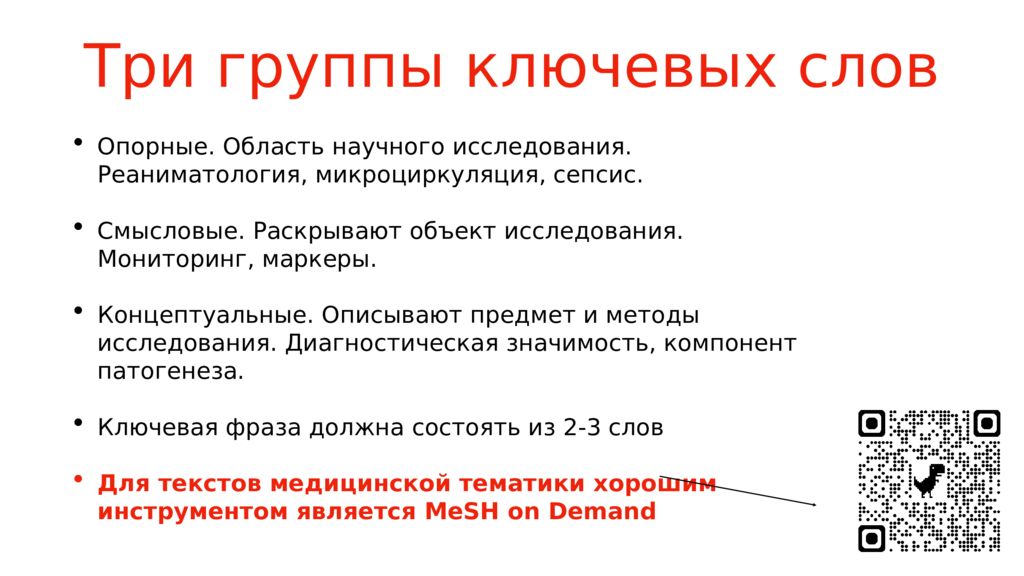 Опорные. Область научного исследования. Реаниматология, микроциркуляция, сепсис. Смысловые. Раскрывают объект исследования. Мониторинг, маркеры. Концептуальные. Описывают предмет и методы исследования. Диагностическая значимость, компонент патогенеза. Ключевая фраза должна состоять из 2-3 слов Для текстов медицинской тематики хорошим инструментом является MeSH on Demand