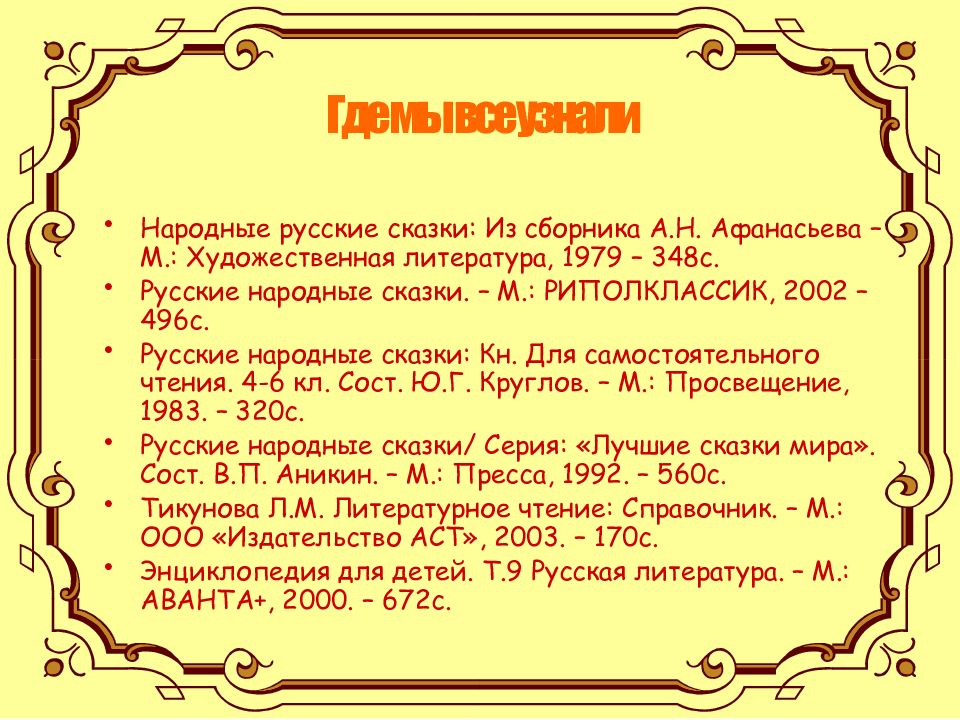 Народные русские сказки: Из сборника А.Н. Афанасьева – М.: Художественная литература, 1979 – 348с. Русские народные сказки. – М.: РИПОЛКЛАССИК, 2002 – 496с. Русские народные сказки: Кн. Для самостоятельного чтения. 4-6 кл. Сост. Ю.Г. Круглов. – М.: Просвещение, 1983. – 320с. Русские народные сказки/ Серия: «Лучшие сказки мира». Сост. В.П. Аникин. – М.: Пресса, 1992. – 560с. Тикунова Л.М. Литературное чтение: Справочник. – М.: ООО «Издательство АСТ», 2003. – 170с. Энциклопедия для детей. Т.9 Русская литература. – М.: АВАНТА+, 2000. – 672с. Где мы все узнали