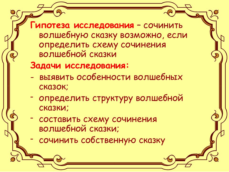 Гипотеза исследования – сочинить волшебную сказку возможно, если определить схему сочинения волшебной сказки Задачи исследования: - выявить особенности волшебных сказок; определить структуру волшебной сказки; составить схему сочинения волшебной сказки; сочинить собственную сказку