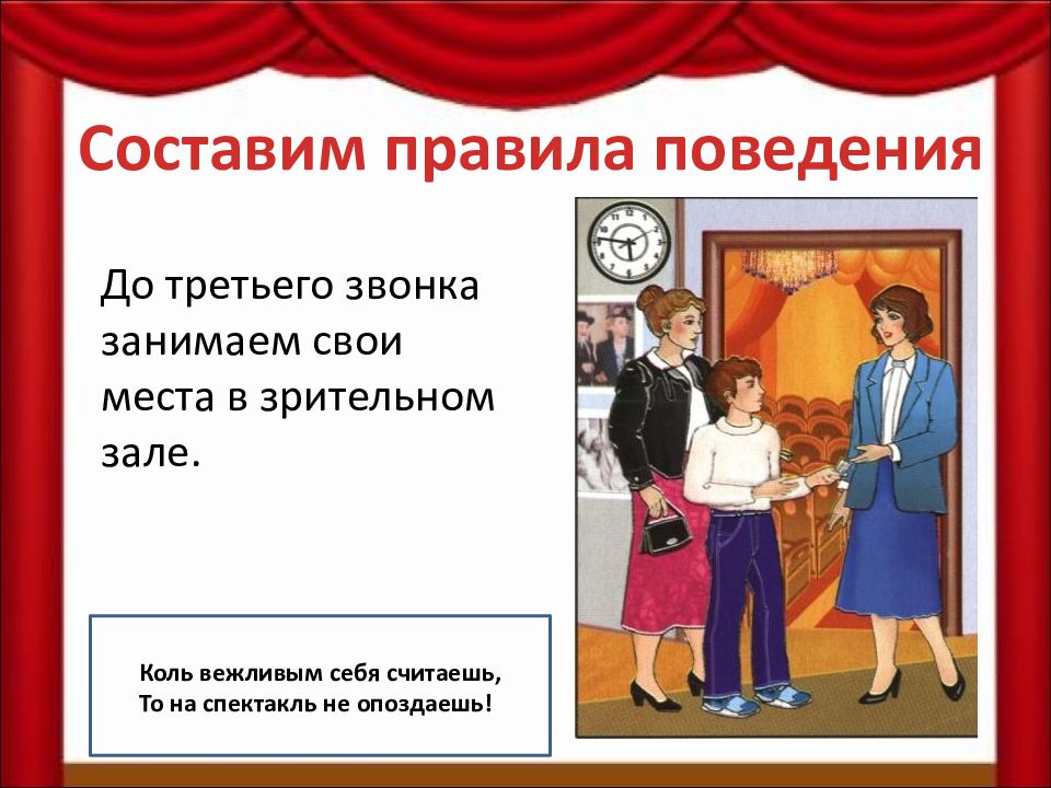До третьего звонка занимаем свои места в зрительном зале. Коль вежливым себя считаешь, То на спектакль не опоздаешь! !
