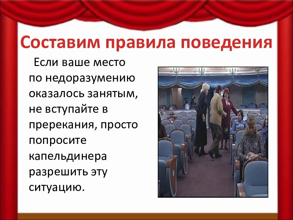 Если ваше место по недоразумению оказалось занятым, не вступайте в пререкания, просто попросите капельдинера разрешить эту ситуацию.