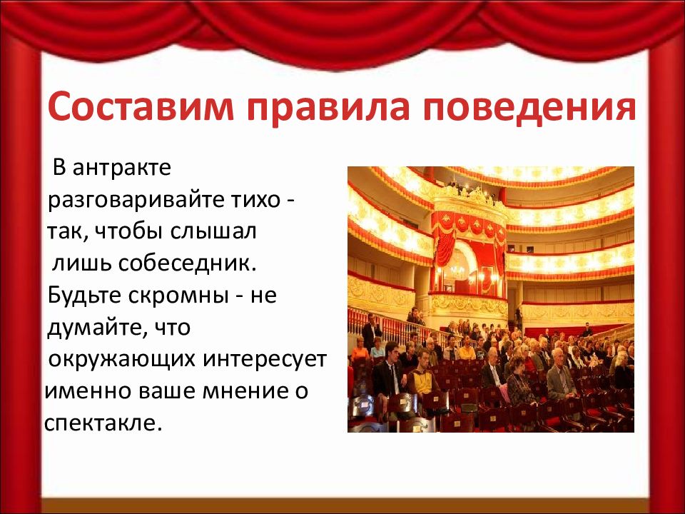 В театр приходим за 10-15 минут до начала представления. Форма одежды – торжественная, праздничная. В театр всегда ходи опрятным, Причесанным и аккуратным! !